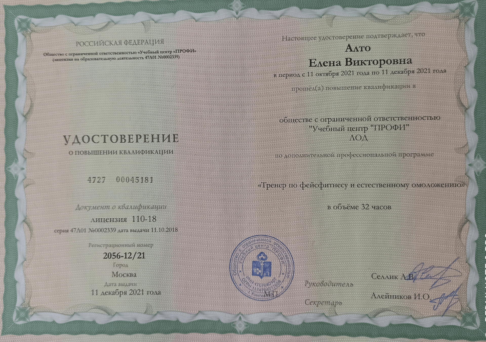Сертифицированный тренер по фейсфитнесу и естественному омоложению